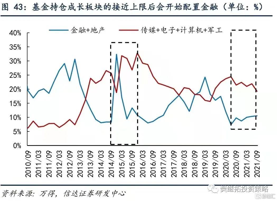樂觀假設下,類似於2014年。表現在兩個方面:①金融地產板塊整體估值已經達到歷史新低,金融股的估值和整個市場的估值差足夠大。這一估值差甚至超過了2018年的水平,與2014年的估值十分相似,那麼金融股很可能出現估值修復的行情。②增量資金可能會流入金融板塊。這與2014年類似,有兩點原因。其一是成長板塊例如計算機、傳媒等板塊,2015年時基金持倉已經達到高位,每隔兩個季度都會進行一次減倉。說明成長板塊的持倉已經接近上限。此時增量資金不是配置強勢板塊,而是配置低估值板塊,這對於金融股有利。二是對於明年增量資金屬性的預測。在第三部分我們預計明年流入的資金更多的集中在保險、私募、兩融等方向,公募基金受指數震盪影響增速放緩。公募基金更多是配置強勢板塊,而保險、兩融基於絕對收益的思路,對新增資金的配置方向是選擇低估值的板塊,屆時會有利於金融股的表現。