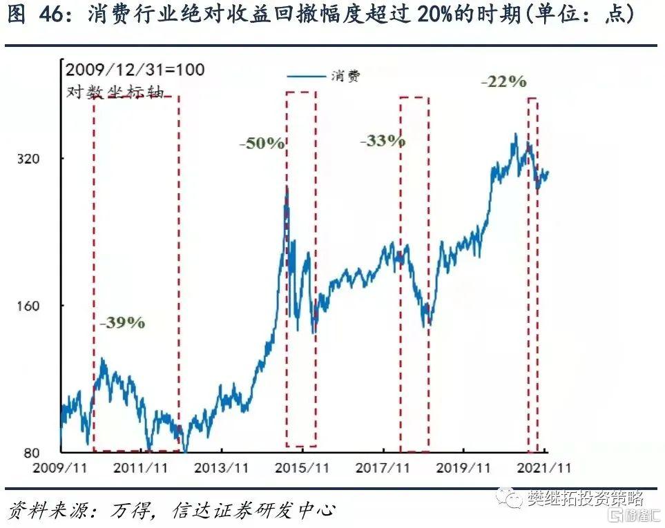 9月以來消費板塊持續反彈,但考慮到前期回撤已經達到歷史較高水平,後續仍有反彈空間。從消費板塊的絕對收益來看,截至11月23日,消費板塊相較2月高點下跌17.6%(截至8月底跌去22%)。從消費板塊的相對收益來看,截至11月23日,消費板塊的相對收益相較6月高點跌去2.8%(截至8月底跌去11%)。歷史上類似情景或者出現在單邊熊市時期,或者對應到部分行業遭遇嚴重的政策利空。從回撤幅度來看,即使存在對消費基本面疲軟導致盈利下降的預期,也基本上已經消化。