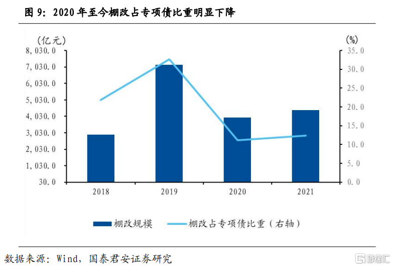 第二,專項債用於保障性安居工程的項目絕大多數投向了棚改,隨着棚改退潮和政策傾斜,專項債有望成為保障性租賃住房建設重要的資金來源。由於專項債對項目收益有嚴格要求,因此一直以來用於保障性安居工程的項目95%以上投向了棚改,最高時棚改佔專項債資金比例達到32.7%(2019年),隨後棚改資金需求快速萎縮,2020年和2021年至今分別佔專項債的11.2%和12.4%。棚改佔比下降的同時,其他類別的保障性安居工程投資體量開始提高。2021年至今棚改佔保障性安居工程比重下降至不足9成,但主要被老舊小區改造所補充,我們僅在深圳11月發行的幾支專項債中明確看到了“保障性租賃住房”的身影,但體量僅有3億。我們認為隨着棚改退潮,政策向保障性租賃住房傾斜,專項債有望成為保障房建設重要的資金來源。