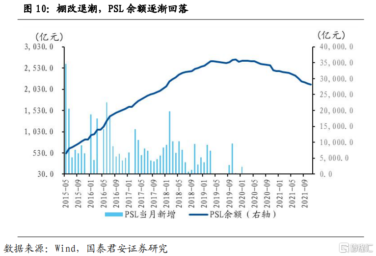 第三,央行重啟PSL為商業銀行補充流動性也是潛在的政策選項。補充抵押貸款規模隨棚改的推進而迅速擴大,高峯時全年淨新增接近萬億;但隨着棚改退潮,2020年以來央行不再進行PSL操作,存量餘額見頂回落。我們認為,保障性租賃住房有望接續棚改,央行重啟PSL為商業銀行的保障房貸款提供流動性,也是可能的政策選項。