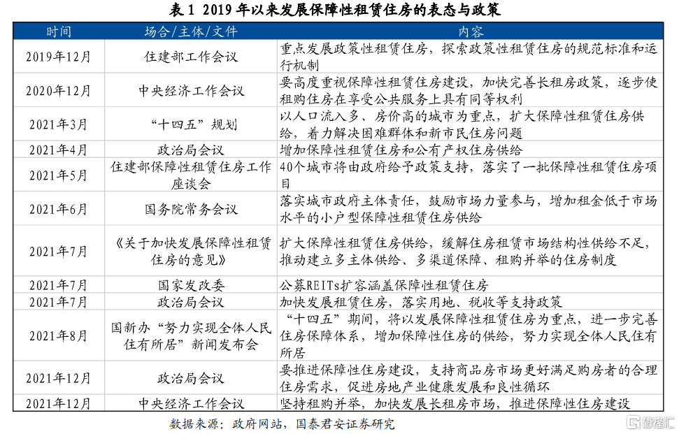 1.當前我國住房保障體系主要由公租房、保障性租賃住房和共有產權房三類構成,其中保障性租賃住房是最大短板。2021年中央和地方密集出台政策,意在理順保障性租賃住房建設機制,預計2022年開工進度將有所加快。