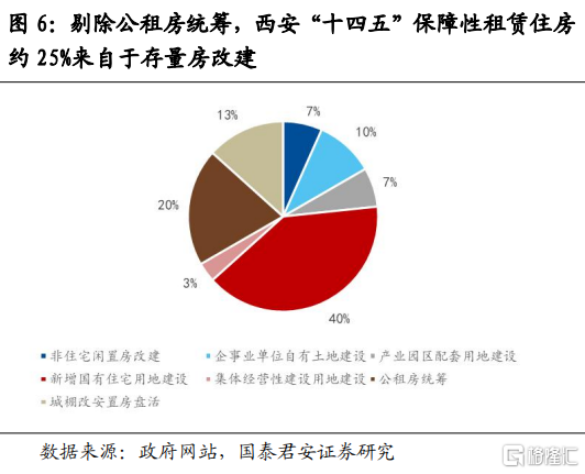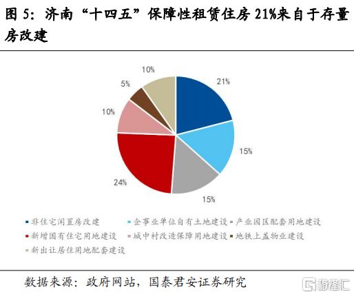 第二,保障性租賃住房籌集來源豐富,存量房屋改建比例在25%左右。保障性租賃住房的供給來源可分為新建和改建兩種。改建就是將閒置的商業用房、廠房、倉儲等非住宅改造為保障性租賃住房,在濟南“十四五”保障性租賃住房規劃中改建比例為21%,西安則為7%,但西安保障房來源中包括的棚改安置房盤活也應算作改建投資,去掉無需增加投資的由公租房統籌的20%,則西安保障房改建投資佔新建+改建的比例為25%。新建保障房中,主要來自於新增國有住宅用地建設(也就是按照常規商品房流程建設的保障房)、企事業單位自有土地建設、產業園區配套用地建設(在產業園區內為解決職住平衡問題新建的職工公寓或宿舍)、以及城中村集體經營性建設用地建設的保障房。