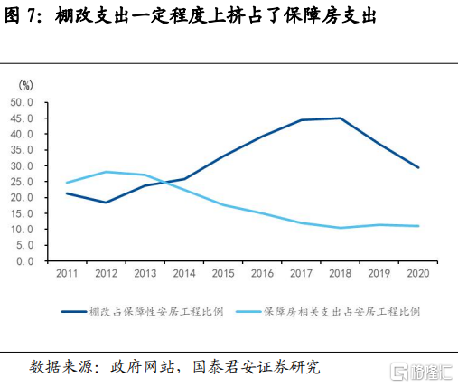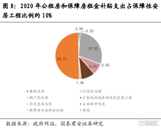 第一,一般公共預算支出中包含保障性安居工程支出,但公租房和保障性租賃住房相關支出僅佔其10%左右,且以租金補貼為主。“保障性安居工程支出”是一級支出科目“住房保障支出”下的二級科目,近年來體量在3000億左右,包括廉租房、棚改、農村危房改造、公租房、保障性住房租金補貼等。其中公租房和保障房租金補貼支出僅佔10%左右,主要原因是資金更多用於棚户區改造(2020年佔比約30%);2018年以後棚改資金佔比下降,保障房相關支出佔比有所上升。但我們認為,隨着財政保民生壓力不斷增大,即使棚改支出減少,一般公共預算也不會大規模參與保障房建設,相關支出以租金補貼為主。