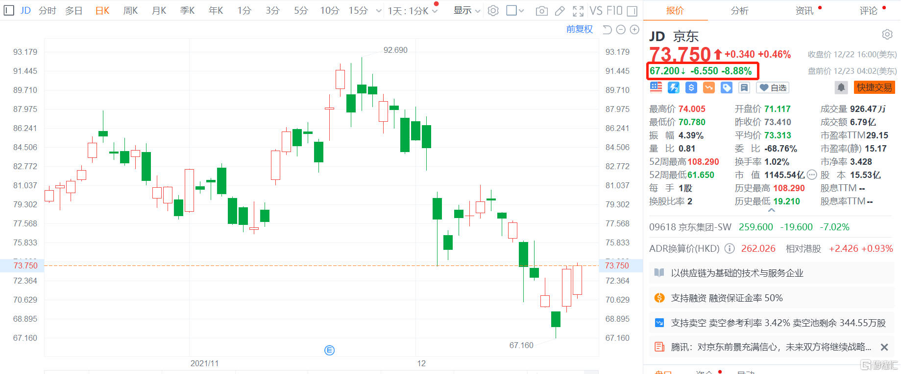 格隆匯12月23日丨京東集團今日於港股市場大跌逾7%。目前,京東(JD.US)在美股盤前交易中跌8.88%,報67.2美元。