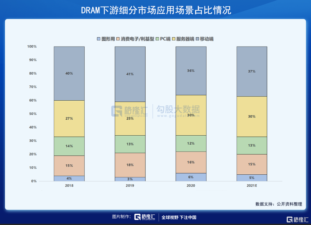 DRAM下遊細分市場應用場景集中,主要應用於智能手機和平板電腦、服務器及PC。在5G熱潮推動下,移動端和服務器端DRAM需求旺盛;PC端進入存量替代市場,出貨穩定;較爲低端的DRAM主要用於消費電子/利基型產品;GDDR存儲芯片則爲圖形專用。