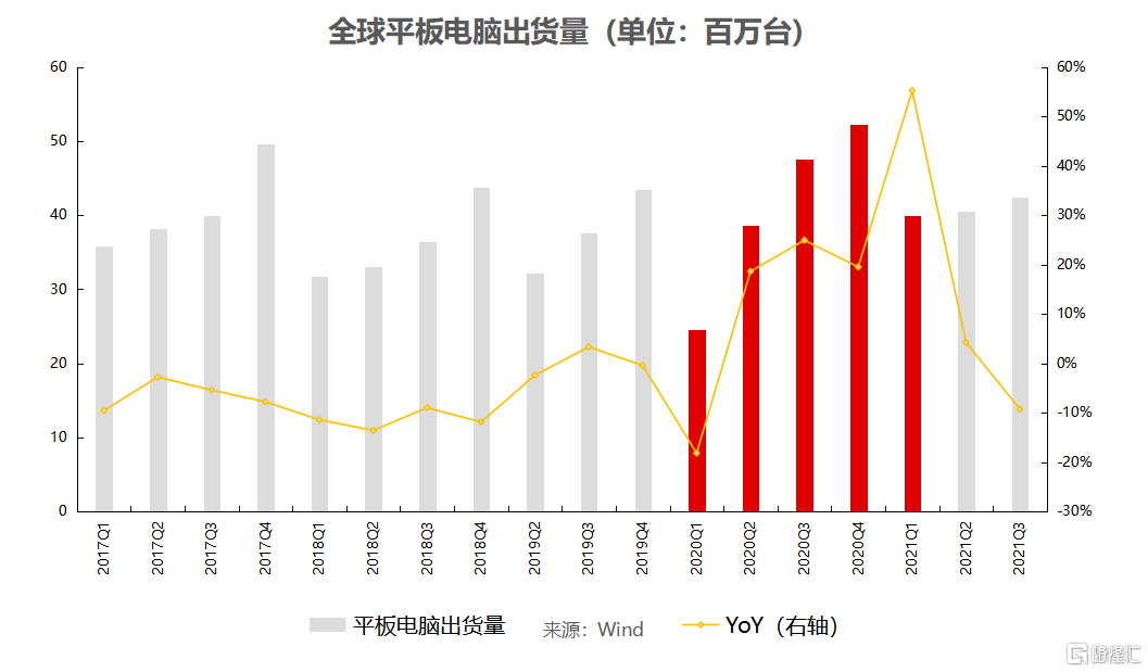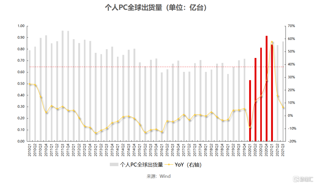隨着智能手機及配套生態的持續發展,PC的出貨量自2011年起就呈緩慢下降趨勢,至19年才實現正增長。自2015年以來,PC每年的出貨量保持在2.5-3億臺之間,隨着移動端及服務器端DRAM的放量,20年PC端DRAM佔比進一步降至12%。當前,由於奧祕克戎新毒株的肆虐,海外疫情形勢依舊嚴峻,居家辦公學習所帶來的強勁需求將至少持續到21年上半年,但PC終端市場需求已有企穩的跡象。