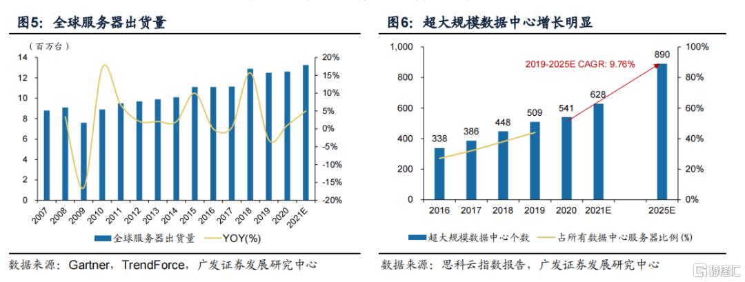 近年來,在雲服務、5G、AIOT等的推動下,計算需求大幅增長,作爲數據存儲與運算的物理基礎,服務器出貨量平穩上升,維持着較高的景氣度。據Gartner,20年全球服務器的出貨量同比增3.9%至1260萬臺。同時,在服務器核心組件中,CPU、GPU 和 DRAM爲主要成本支出,合計佔比約 32%,在更高性能的服務器中甚至高達 50%-83%。