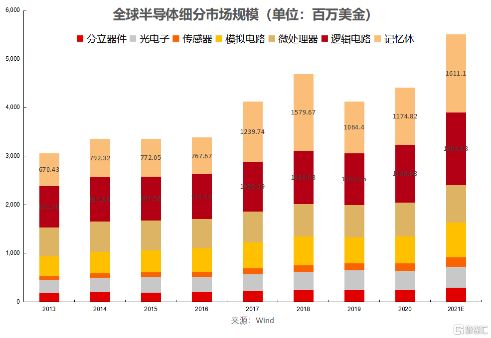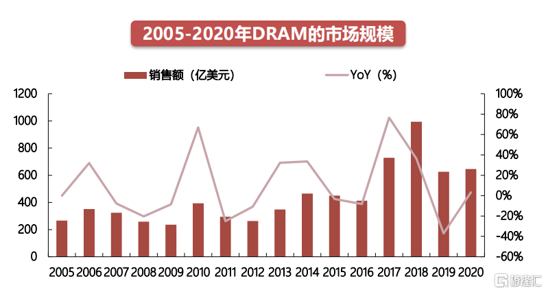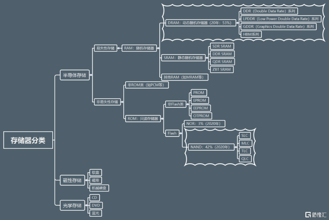 1、存儲器是全球半導體最大的細分領域,而20年DRAM(53%)和NAND Flash(42%)合計佔據存儲芯片95%的市場份額,其中,DRAM以其經濟、可靠、高效的特點,被廣泛運用於移動設備、服務器、PC等市場;