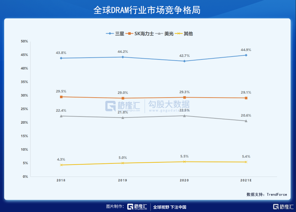 2、DRAM行業採用IDM重資產運營模式,各廠商競爭的核心在於製造工藝與生產規模,高昂的廠房設備投資及後續的大額研發管理費用,形成較高的行業壁壘,市場集中度不斷提升,目前DRAM行業爲三星、SK海力士和美光三大寡頭所壟斷,CR3≈95%;