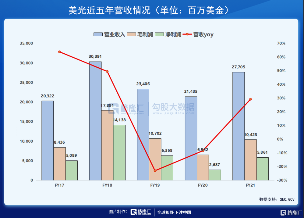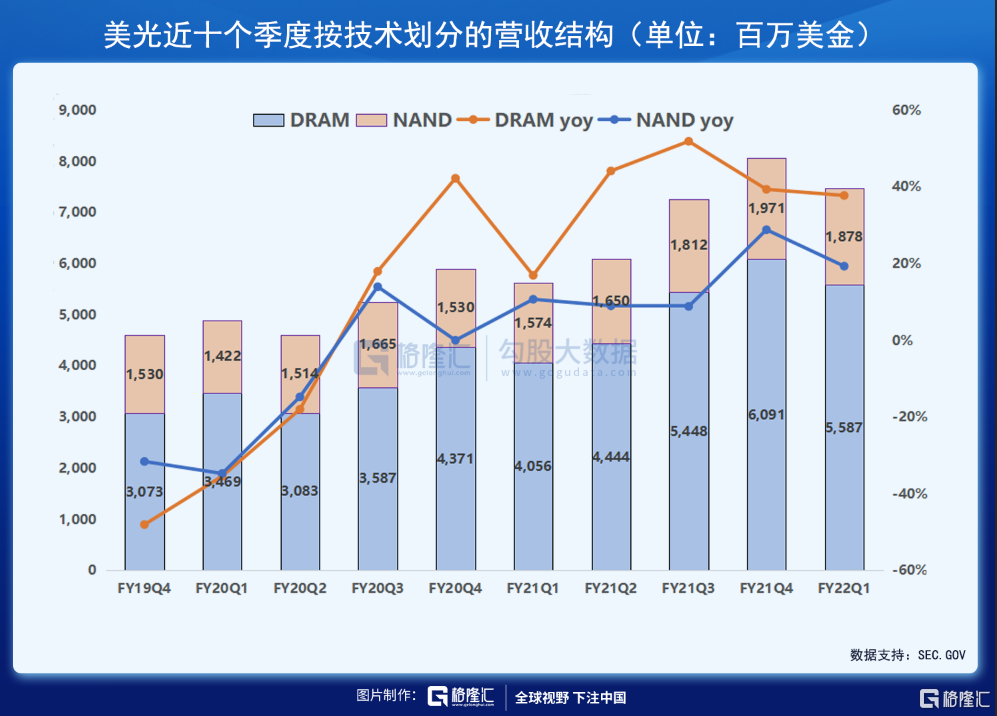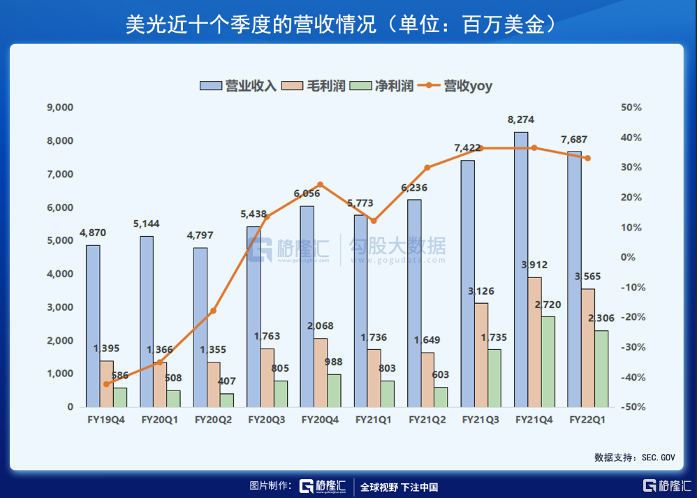 作爲全球DRAM和NAND存儲芯片龍頭,美光也在DRAM的週期回暖中實現營收V型反轉。在強勁的產品組合勢頭的帶動下,美光FY22Q1業績穩健:營收同比增33.2%至76.87億美元,超預期的76.5億美元;毛利同比增105.4%至35.65億美元;淨利同比增187.2%至23.06億美元;攤薄後EPS同比增187.3%至2.04美元。