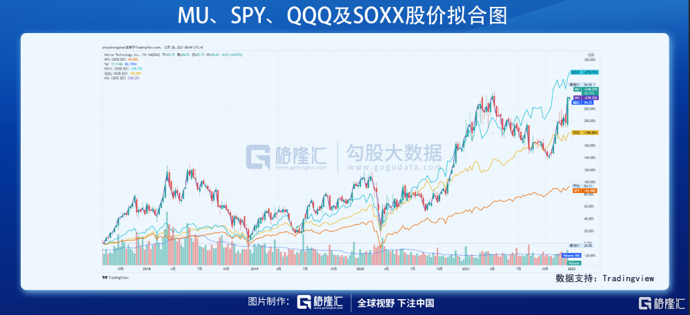 截止21年12月27日收盤,美光科技年內漲幅爲25.78%,有一半以上的漲幅(15.12%)是受12月20日盤後發佈的FY22Q1財報推動的,跑輸同期納指100ETF(QQQ:29.23%)、標普500指數ETF(SPY:29.36%)及費城半導體指數(SOXX:47.59%)的漲幅。此前,市場認爲內存需求將會下降,導致供過於求,並導致內存價格暴跌,這使得在2021年的大部分時間裏,美光的股價一直受到打擊。