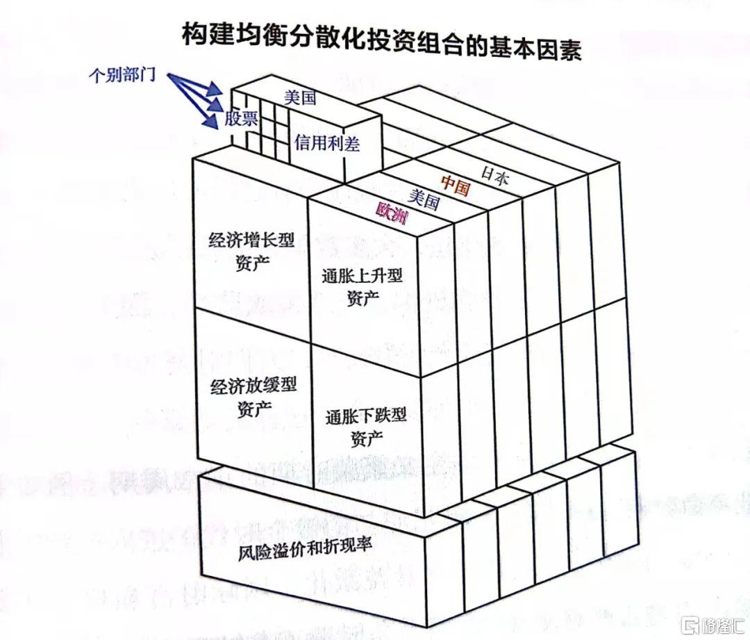 在瑞·達利歐看來,每項投資都以自身的方式反映了這些驅動因素,從未來現金流的角度來看,這是合乎邏輯的。每一項投資資產都是一個投資組合的組成部分,而投資者面臨的挑戰是,如何根據這些驅動因素妥善地構建投資組合。例如,當經濟增速高於預期時,在其他條件不變的情況下,股票價格將會上漲;而當經濟增速和通脹率高於預期時,債券價格將會下跌。瑞·達利歐的目標是,將這些基本因素納入投資組合的戰略決策中,基於當前和未來的世界形勢(影響這 4 個決定因素),構建具有良好分散性和戰術傾斜的投資組合。這些基本因素適用於國家、環境偏好、單個行業和公司等不同層面。