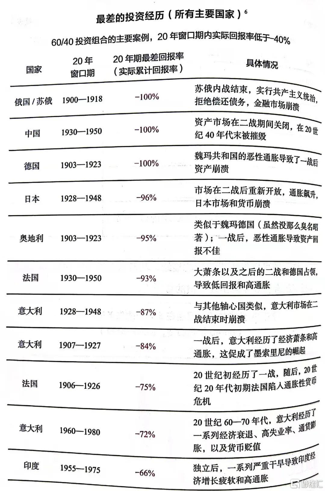 他發現,這10個國家中,有 7 個國家至少經歷過一次幾乎所有財富都全部消失。即使是那些沒有經歷過財富全部消失的國家,也經歷了幾個糟糕的10 年,資產回報幾乎摧毀了它們的財務。其中有2個發達國家(德國和日本),在兩次世界大戰中損失了幾乎所有財富和許多生命。