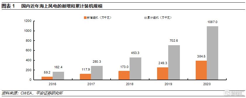 近年國內海風裝機高速增長,國補時代即將結束。2014年6月,國家發改委發佈《關於海上風電上網電價政策的通知》,明確潮間帶風電項目含稅上網電價爲每千瓦時0.75元,近海風電項目含稅上網電價爲每千瓦時0.85元。標杆電價的出臺對於我國海上風電發展起到極大地推動作用,從此,國內海上風電發展步入快車道;2020年,國內新增吊裝的海上風電裝機規模達到3.84GW,累計吊裝規模超過10GW。根據相關政策,前期已覈準、2021年年底前全容量併網的海風項目才能享受中央財政補貼,2021年成爲國內海上風電的搶裝年,估計新增裝機規模同比大幅增長。2022年起,中央財政補貼退出,海上風電的平價時代來臨。
