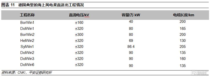 直流海纜的輸送能力相對更強。三峽如東項目採用直流送出,電壓等級±400kV,截面積1600mm2,單回(正負2極)的輸送能力能夠達到100萬千瓦。歐洲多個海上風電項目採用柔直送出,±320kV電壓等級的直流海纜單回輸送能力達到90萬千瓦。