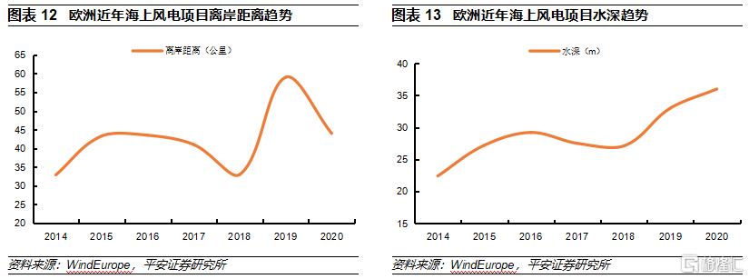 參考歐洲經驗,海上風電離岸化是趨勢。向深遠海發展是歐洲海上風電發展過程中較明顯的趨勢,截至2020年歐洲在建海上風電項目平均離岸距離44公裏,其中英國的Hornsea One、德國的EnBW Hohe See和EnBW Albatros等海上風電項目離岸距離超過100公裏;截至2020年歐洲在建海上風電項目平均水深36米。