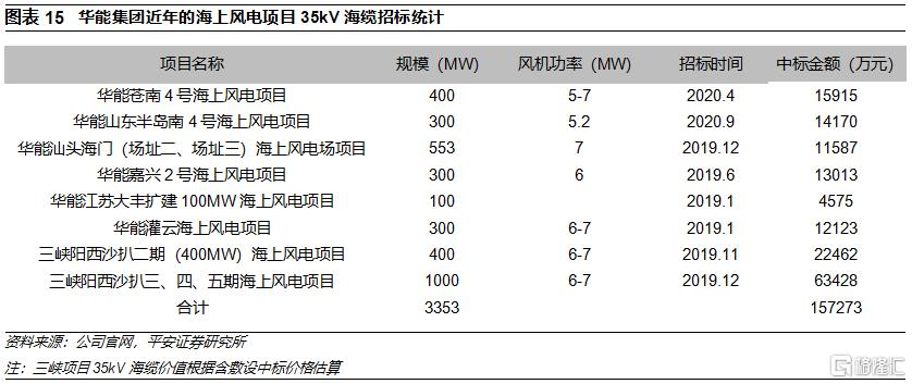 35kV是集電海纜主流,單位千瓦價值約470元。集電海纜主要將風電機組的電力彙集至升壓站或換流站,常見電壓等級是35kV,根據截面積情況,35kV海纜包括3×70mm2、3×95 mm2、3×185 mm2、3×300 mm2、3×400 mm2等多種型號。根據對華能、三峽近年招標的海纜項目情況統計,估算單位千瓦的35kV海纜造價大概在470元左右。據統計,單體規模較大項目的35kV海纜的單位千瓦價值量相對較高,以三峽陽西沙扒三、四、五期海上風電項目爲例,該項目規模1000MW,採用單機容量6.45-7.0MW單機容量的風電機組,單位千瓦集電海纜採購價格超過600元。