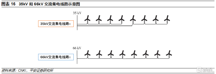 66kV集電海纜是趨勢,有望降低集電海纜造價。隨着海上風電單機容量和規模的不斷增大,35kV交流集電方案可互聯的風機數量越來越少,35kV海纜越來越長。66kV交流集電方案在歐洲風電市場已得到初步應用,國內市場的應用場合也有望增加,根據披露的招標信息,三峽陽江青洲五、六、七海上風電項目均採用66kV集電海纜方案。66kV高電壓等級的應用,提高了海纜的載流能力,與35kV方案相比,當海纜導體截面積相同時,66kV海纜最多可連接風機的數量爲35kV海纜的2倍,集電海纜長度的減少能夠降低損耗、減少徵海使用面積、減少海纜施工工作量等,在單機容量越大以及項目總裝機容量越大的情況下,66 kV集電海纜的優勢越明顯。根據相關研究結論,假定未來某近海深水區開發的海上風電項目總裝機容量爲1000 MW,佈置100臺10MW的風力發電機組,採用35kV集電方案的海纜採購費用約6.6 億元,海纜施工與徵地費用約3億元,而採用66kV集電方案的海纜採購價格約4.2億元,對應的海纜徵地與施工費用約爲1.4億元。