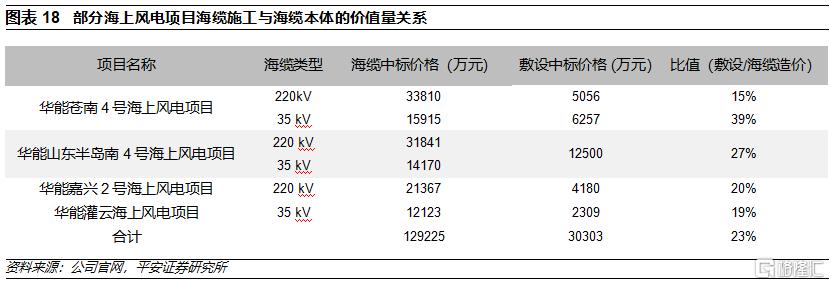 交流海纜敷設的價值量約佔海纜本體價值的20%以上。結合部分已建項目的海纜及海纜敷設中標情況,估算海纜敷設的價值量約佔海纜本體價值的20%-25%。一般而言,三峽、中廣核等運營商將海纜本體及海纜敷設打包進行招標,中標企業主要爲海纜製造企業;近年,中天科技、東方電纜等海纜製造企業着力提升自身的施工能力,是海纜敷設施工的重要參與方。