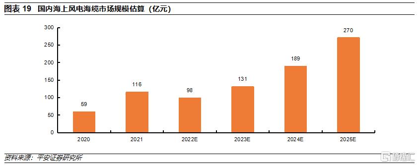 2025年國內海上風電海纜(集電+送出)需求有望達到270億元以上。根據前期預測,2025年國內海上風電新增裝機有望達到18GW,按照單位千瓦的海纜造價超過1500元估算,則對應的海纜需求有望達到270億元以上,較2021年110-120億元的國內海上風電海纜市場規模明顯增長。