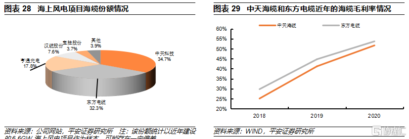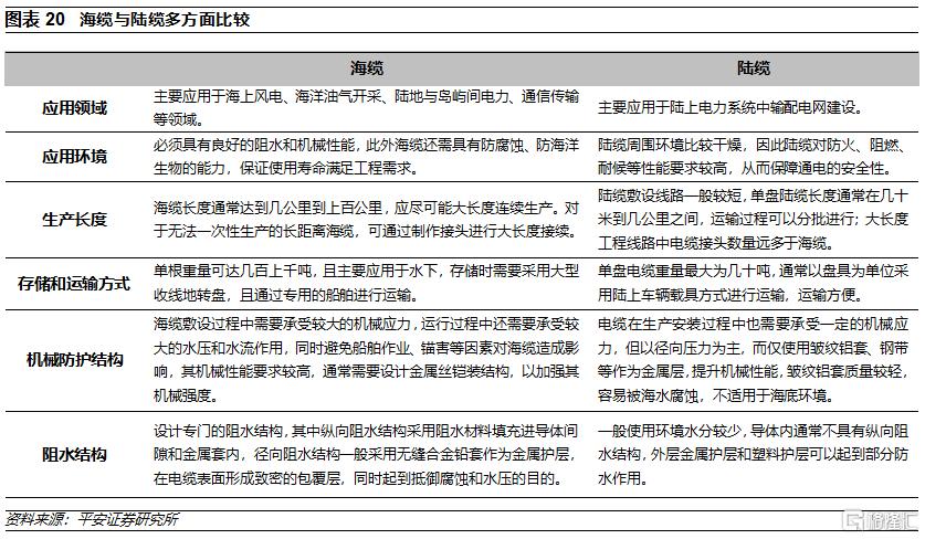 海纜是海上風電的核心環節,隨着海上風電項目的離岸化發展,單位海風項目的海纜需求量有望提升;同時,海纜具備較高的準入壁壘,競爭格局清晰、穩定,頭部企業有望維持較高的市佔份額,並享受海上風電大發展和海纜價值量提升的紅利。推薦技術實力和份額領先、具有屬地優勢的企業。