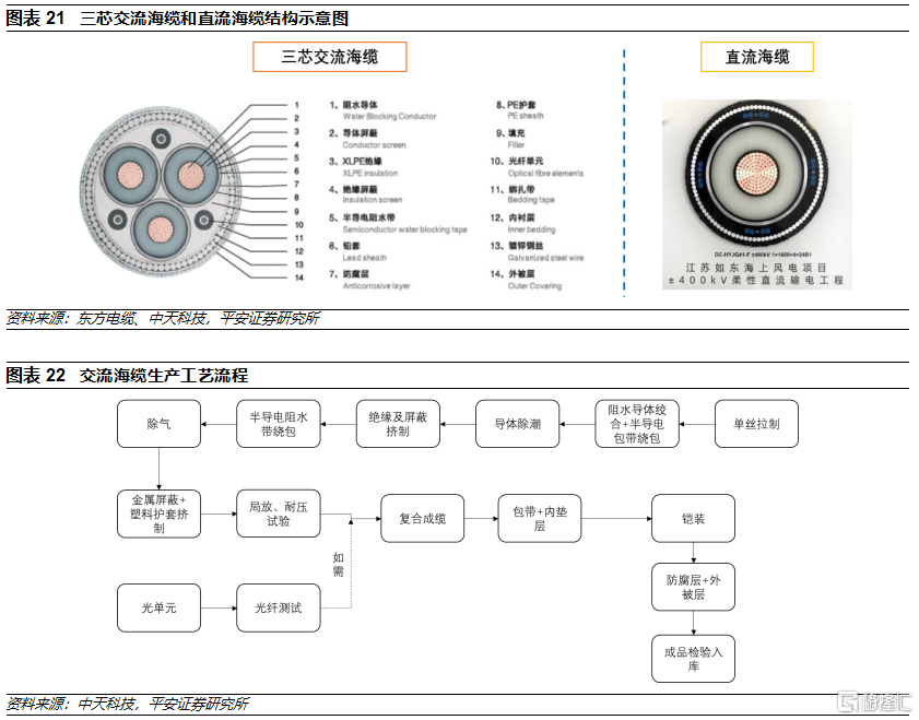 生產工藝較爲複雜,交聯聚乙烯是海纜主要絕緣方式。交聯聚乙烯(XLPE)海纜具有優異的電氣和力學等方面性能,在我國海洋電力傳輸領域,XLPE絕緣海纜的使用範圍越來越廣,已經基本替代油紙絕緣海纜。海纜製造工藝流程較長,導體絞合、絕緣擠制、絕緣除氣、大直徑鉛套擠制工藝對海纜本體質量較爲關鍵,其中導體絞合、鉛套擠制質量關係到海纜的重要性能——阻水性能的優劣,絕緣擠制和除氣則關係到海纜中主絕緣性能。