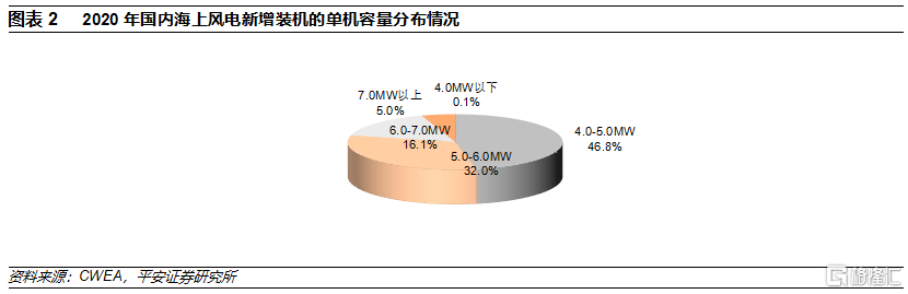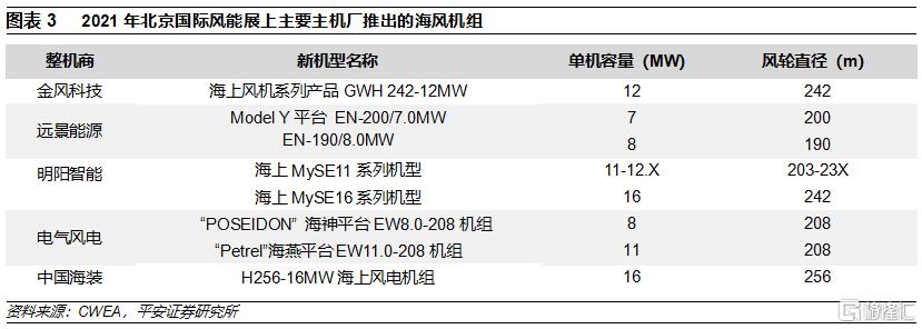 國內風機企業已經儲備好海上大型風機技術,單機容量有望快速提升。2020年,國內新增海上風電裝機3.84GW,平均單機容量約4.9MW,2021年是海上風電搶裝年,估計單機容量同比增長幅度不大。2021年搶裝之後中央財政補貼退出是行業內早已形成的共識,風機企業近年的新機型開發主要面向平價市場。目前看,風機企業新推的海上風電機組單機容量明顯大於近年投運項目的單機容量,新推機組最大單機容量達到16MW,意味着搶裝結束之後國內海上風電單機容量將快速提升。2021年12月,華潤電力蒼南1號海上風電項目開工,該項目作爲國內率先平價的海風項目,規劃裝機容量400MW,擬安裝49臺抗颱風型海上風電機組(對應的平均單機容量超過8MW),其中將批量應用中國海裝H210-10MW海上風電機組。