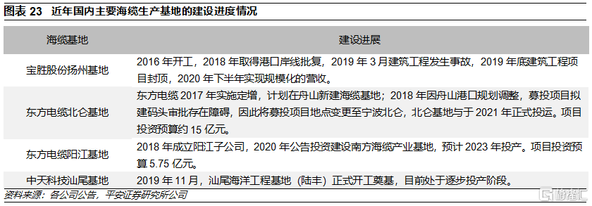 海纜對生產設備和碼頭岸線的要求較高,擴產週期較長。海纜產品結構較爲複雜,對生產設備要求較高,通常涉及VCV立塔交聯生產線、CCV懸鏈交聯生產線、盤框絞機等設備,其中VCV交聯生產線主要設備依賴國外進口。此外,海纜屬於重型部件,需要通過專門的海纜敷設船進行運輸,通常要求海纜企業靠近江河湖海等水域,由於碼頭岸線資源日益稀缺,對新進入企業或行業內原有企業擴產形成一定的壁壘。正因爲如此,海纜新建生產基地的建設週期較長,近年,東方電纜北侖基地、東方電纜陽江基地、中天科技汕尾基地、寶勝股份揚州基地等新建的海纜生產基地的建設期均在2年及以上,考慮前期準備工作,建設的週期更長。
