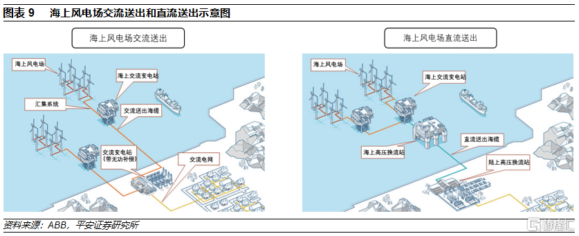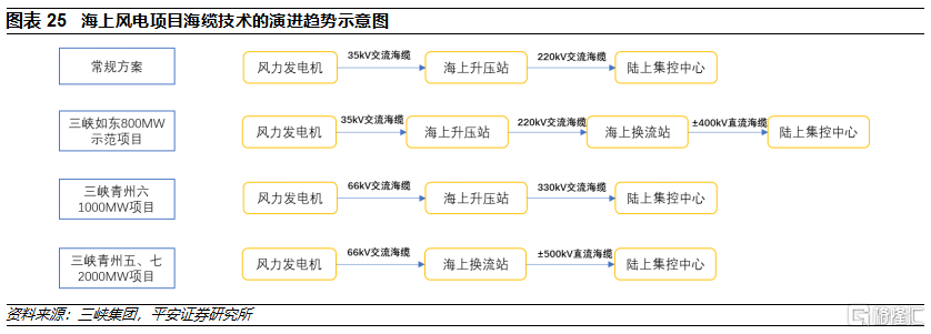 集電海纜和送出海纜電壓等級上升是趨勢。隨着海上風電單體規模的增大以及離岸化發展,集電海纜電壓等級升級至66kV可能是趨勢;送出方面,一方面直流海纜的應用比例將提升,另一方面交流海纜的電壓等級也有望提升,未來330kV和500kV的交流送出方案有望獲得應用。