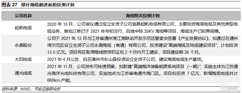 3、 目前多家企業計劃涉足或加碼海纜製造,未來不排除海纜企業競爭加劇以及盈利水平不及預期的可能。