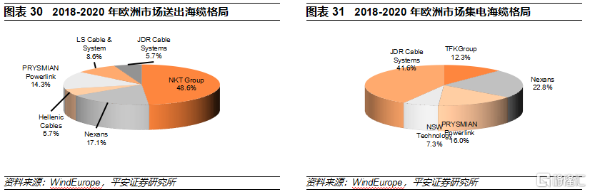 歐洲海上風電海纜格局較穩定。歐洲作爲成熟的海上風電市場,具備完善的海纜產業;根據2018-2020年歐洲海上風電項目的海纜供應情況,送出海纜的主要供應商包括丹麥的安凱特(NKT Group)、法國的耐克森(Nexans)、意大利的普瑞斯曼、韓國的LS等;集電海纜的主要供應商包括英國的JDR、法國的Nexans、意大利的普瑞斯曼等。