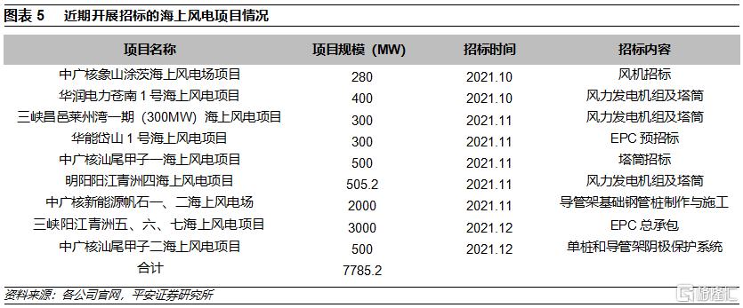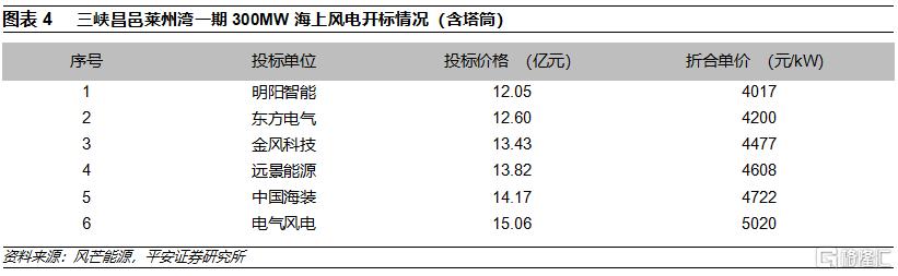 近期招標顯示海上風電主設備已降價35%。近期,中廣核象山塗茨海上風電場項目(280MW)和華潤電力蒼南1號海上風電項目(400MW)已經完成風機招標,華潤電力蒼南1號海上風電項目風機及塔筒的中標企業爲中國海裝,總報價16.24億元,相當於單位千瓦的風機及塔筒採購價格4060元。三峽昌邑萊州灣一期300MW海上風電項目的風機及塔筒採購於近期開標,其中明陽智能的報價爲12.05億元,該項目在2019年實施過招標,當時明陽智能的報價爲18.6億元,即風機和塔筒的採購價格大概下降了35%。