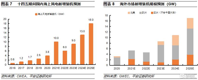 全球風能協會預測十四五期間海外海風市場高速增長。隨着歐洲海上風電技術的逐步成熟以及規模化發展,在全球低碳發展的大背景下,海上風電的發展浪潮已經從歐洲蔓延到美國、日本、韓國等。根據全球風能協會的預測,到2025年,海外市場的海風新增裝機有望達到約17GW,較2020年增長約4.6倍,2020-2025年間的複合增速達到41%;整體看,歐洲市場穩步增長的同時,美國和亞洲新興市場有望跨越式發展。