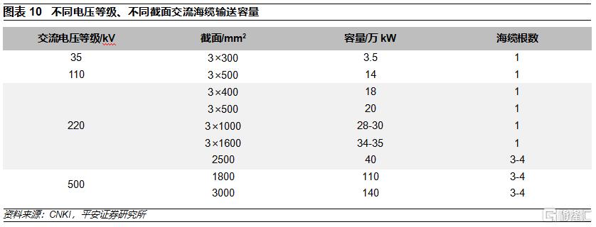 不同電壓等級和型號的交流海纜的電能輸送能力不同。國內目前主流的交流送出海纜電壓等級爲220 kV,一般採用單回三芯結構,輸電能力18-35萬千瓦,其中3×500mm2的型號最爲常見。220kV更大截面海纜(超過2500mm2)以及500 kV海纜輸電能力可達到40萬千瓦以上,但受絕緣要求以及製造、敷設技術等影響,需採用單芯結構,單回需鋪設3-4根(考慮備用相時需4根),佔用海底走廊資源較大。