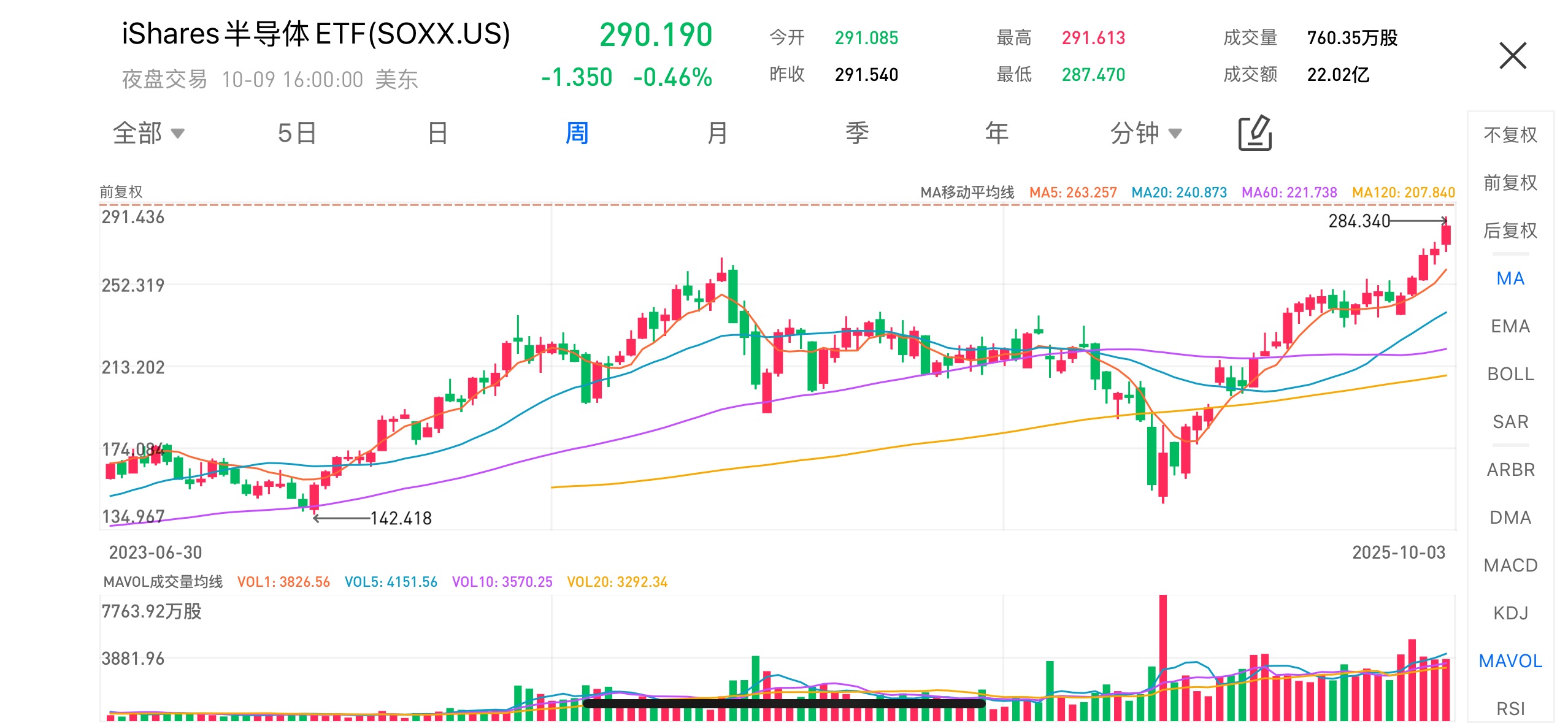 其中,iShares半導體ETF(SOXX.US)表現穩健。自2023年下半年起,SOXX股價從低點約142美元一路上行至290.19美元,漲幅超過100%,期間呈現出典型的長期上升趨勢。SOXX重倉英偉達、臺積電與博通等AI核心供應商,其價格走勢與AI晶片需求密切相關。