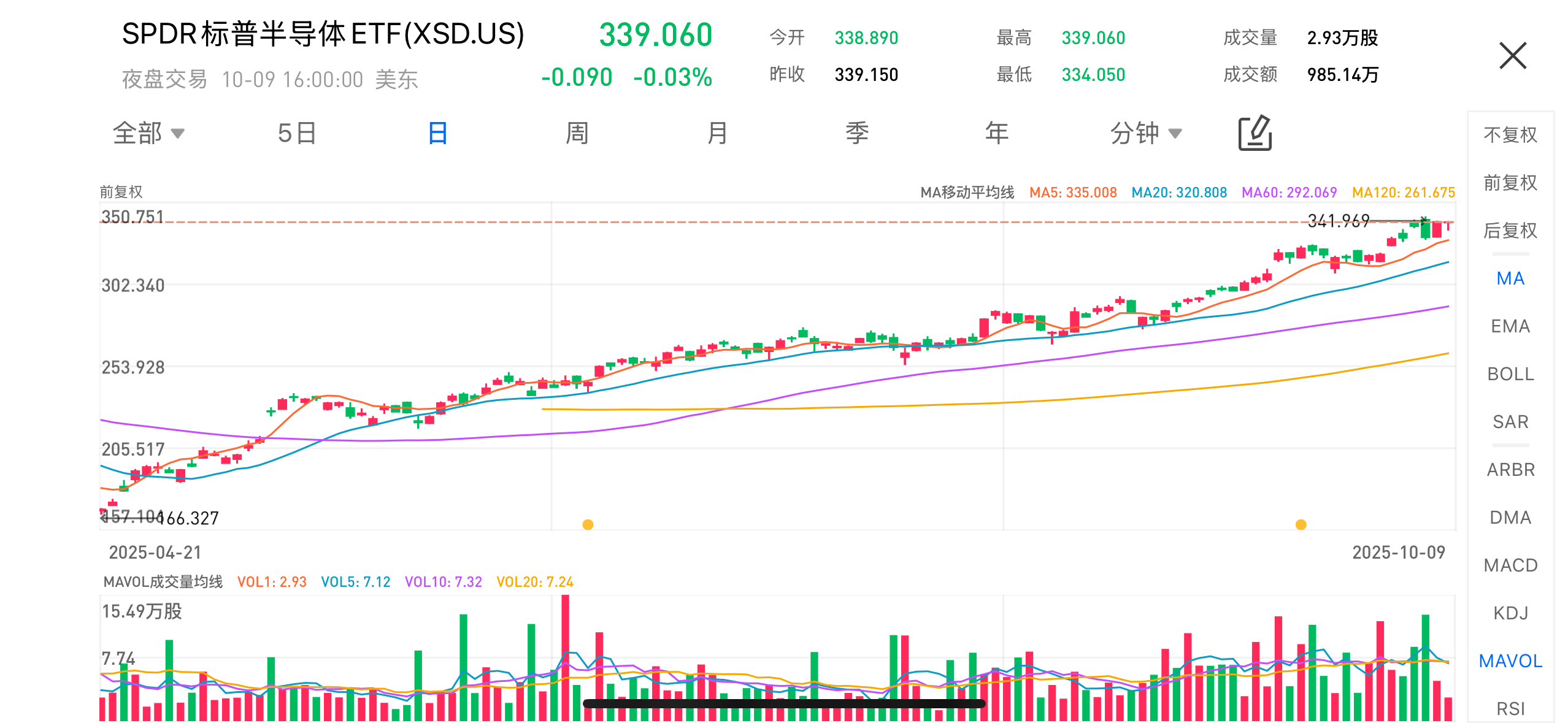 另一支代表性的ETF是SPDR標普半導體ETF(XSD.US)。與SOXX不同,XSD採取等權重配置方式,使中小型半導體公司也能獲得較高權重。從圖表看,XSD自2024年4月以來保持強勁上漲趨勢,從約166美元上升至339.06美元,年內漲幅超過100%,顯示市場對AI供應鏈中層企業的信心顯著增強。