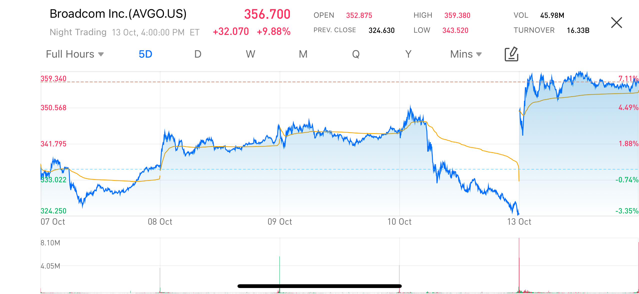 2025年10月13日,OpenAI宣佈與博通公司(Broadcom)合作,共同推出首款自研AI晶片,域引發了巨大的關注,並成為市場焦點。在宣佈合作的消息後,博通的股價在當天的交易中迅速飆升,漲幅接近10%,市值一度暴漲1500億美元,達到356.7美元。根據股市數據,博通的股價表現出強勁上漲趨勢,尤其是在10月13日的交易中,股價達到了新高。