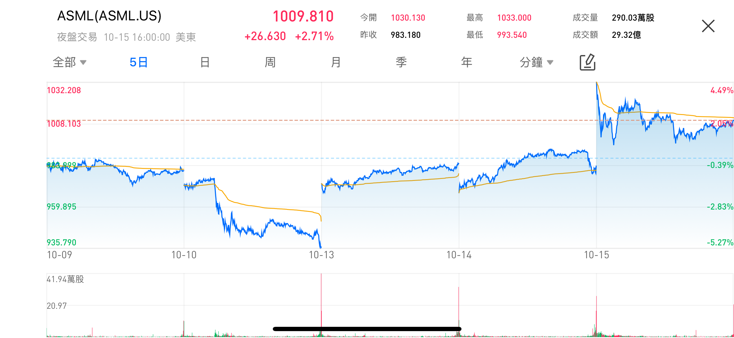 2025年10月15日,阿姆斯特丹 / 紐約訊 —— 全球光刻機龍頭阿斯麥(ASML.US)公佈2025年第三季度財報後,股價在美股交易中強勢上揚,收於 1009.81美元,漲幅 2.71%,盤中最高觸及 1033美元,成功突破千美元關口,創下近兩個月來新高。