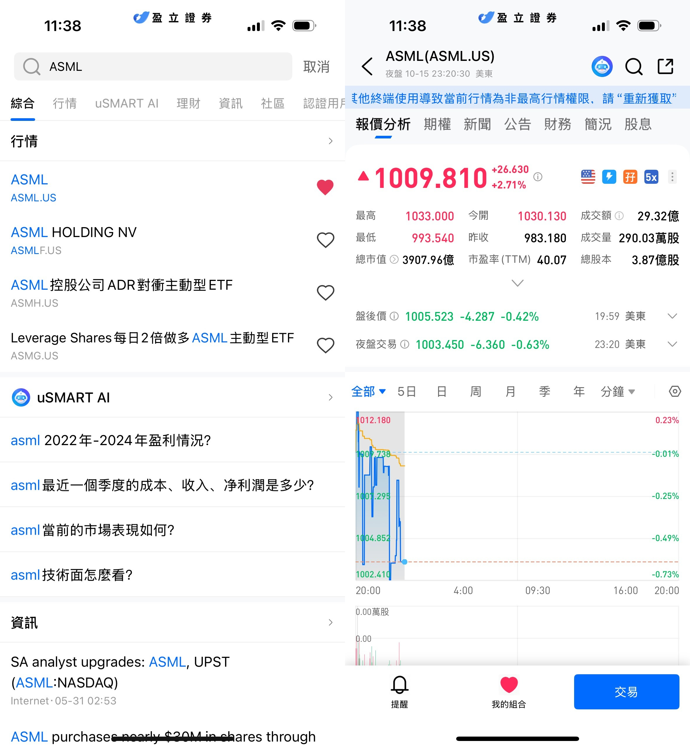 登入 uSMART HK APP 後,於頁面最右上方點擊「搜索」,輸入標的代碼(ASML.US)並進入詳情頁,瞭解交易詳情與歷史走勢。點擊右下角「交易」,選擇交易類型,最後填寫交易條件後送出訂單即可。