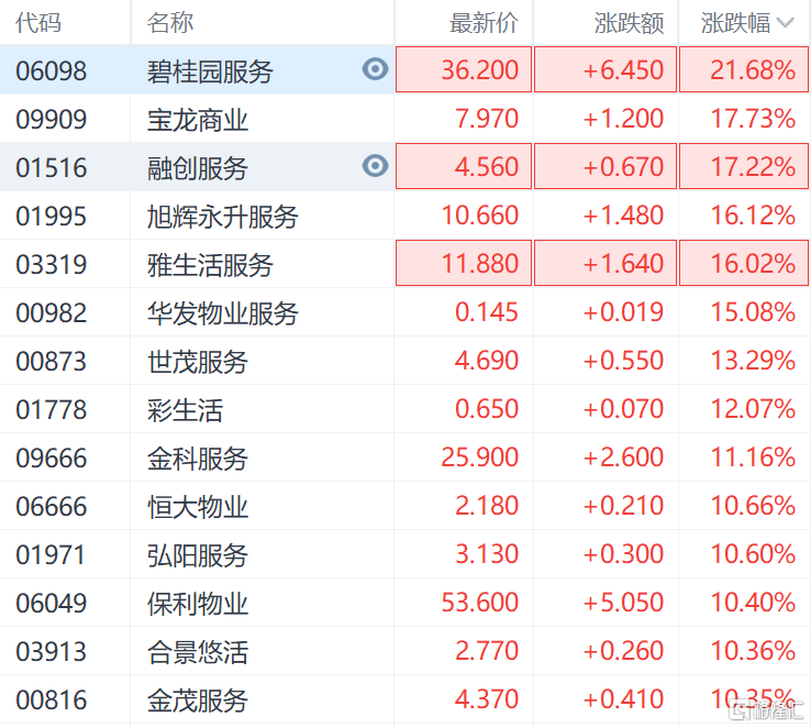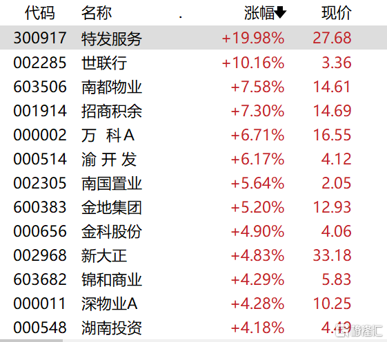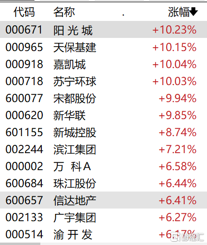 消息面的刺激下,A股房地產服務、房地產開發、物業管理等板塊漲幅居前,多股漲停。特發服務、陽光城、天保基建、嘉凱城、蘇寧環球、宋都股份等漲停,新華聯漲超9%,新城控股漲超8%,招商積餘、南都物業漲超7%,萬科 A、珠江股份漲超6%。