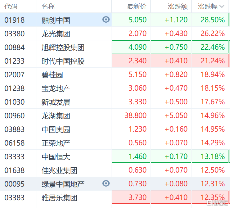 港股地產、物業股也是暴漲,融創中國漲28%,龍光集團漲超26%,旭輝控股集團漲超22%,時代中國、碧桂園服務漲超21%,碧桂園、寶龍地產漲超18%。