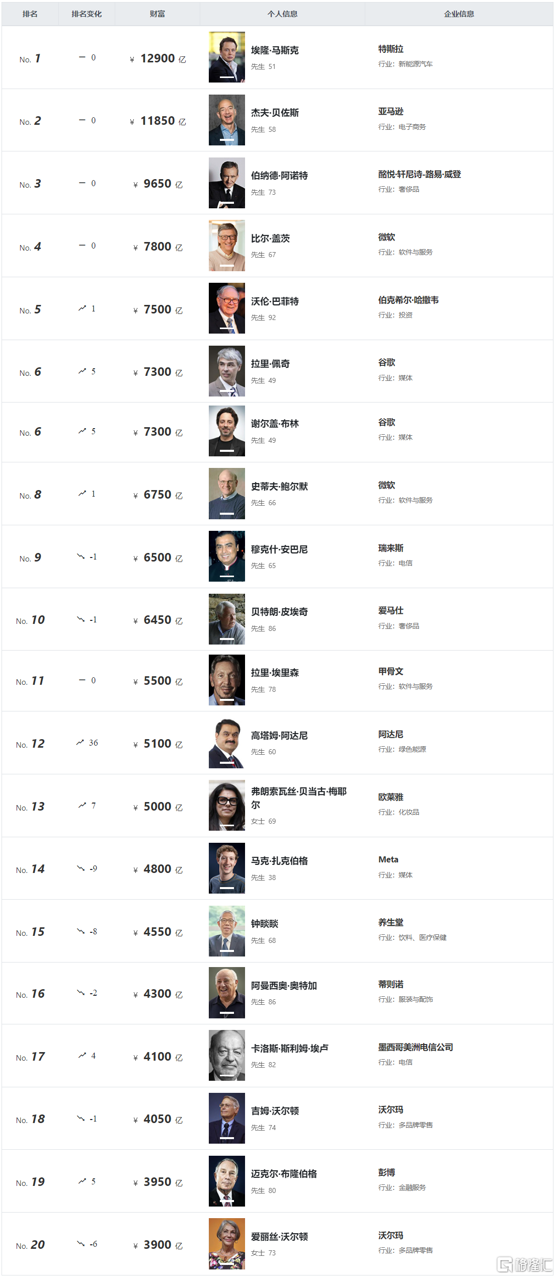 前十名中有兩位新面孔:谷歌母公司Alphabet的謝爾蓋·布林和拉裏·佩奇。馬克·扎克伯格和中國“瓶裝水大王”鍾睒睒跌出前十。