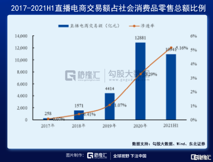 受疫情影響,直播電商模式大行其道。公開數據顯示,2021年上半年,直播電商交易額已經突破1.09萬億,全年突破2萬億確定性較強;直播電商額佔網上商品和服務零售額比例已經達到17.9%,相較於2020年底的10.95%顯著提升近7%,同樣,直播電商對於社會消費品零售總額的貢獻度也從2020年底的3.29%提升至2021年中的5.16%。
