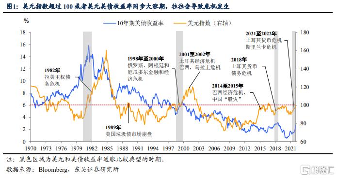 從歷史上看(圖1),無論是美元站上100還是美元和美債收益率同步大幅上漲,往往會帶來市場動盪、滋生新興市場危機。2022年4月1日斯裏蘭卡總統宣佈全國進入公共緊急狀態,斯裏蘭卡的“暴雷”是否敲響了清空新興市場資產的“警鐘”?