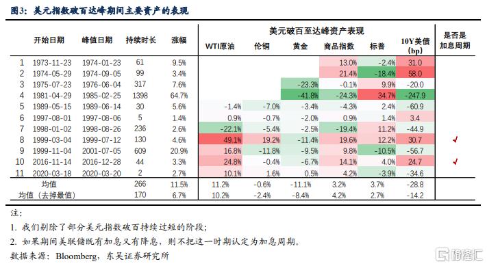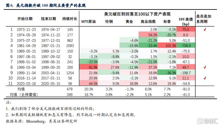 無論從利差,資金流動,還是從全球經濟和貿易的邏輯看,美元指數的拐點還沒有到來,第二季度將階段性站上100。從歷史回顧上看,美元指數站上100美元期間,以原油爲代表的大宗商品表現最好;股市表現平平,尤其是在美元和美債收益率同漲的情況下跌多漲少;金價將承受一定的壓力,不過本輪金價上漲背後存在交易美國經濟衰退的邏輯,金價可能會更多呈現震盪的特徵。