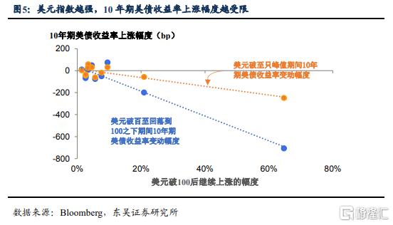 從邏輯上看,美債收益率上漲帶來的利差優勢應該會支撐美元匯率,然而事實上美元指數和10年期美債收益率同步大幅上漲的情況並非主流。從歷史上看,加息週期中美元站上100之後,美債收益率仍會繼續上漲,但美元指數的升值幅度、在100上方持續的時間,和10年期美債收益率上漲幅度呈現一定的負相關。在金融條件收緊的效果上,兩者存在替代性(圖5)。
