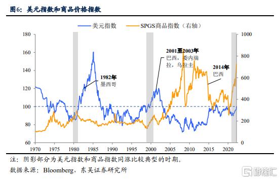 其中前者比較常見,美元大幅上漲背後一定程度上反映了全球經濟放緩,需求下降帶來商品價格大幅下跌,這往往發生在一輪商品牛市之後,商品出口型新興市場經濟體將受到較大沖擊(圖6);後者並不多見,強美元和商品價格大漲下,商品出口國匯率和出口收入都會改善,受衝擊較大的往往是缺乏資源、對外依存度較高(或外債規模較大)的小型經濟體。