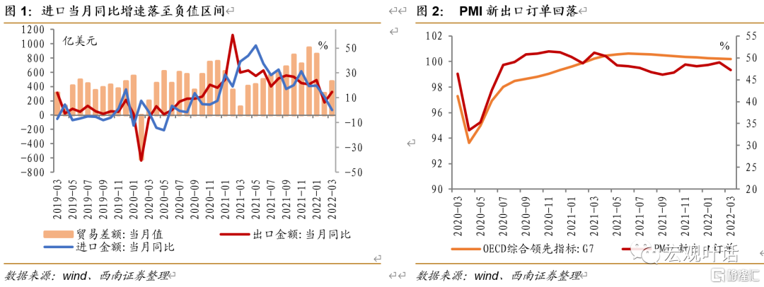 單月來看,3月我國貨物貿易進出口總值爲5047.9億美元,同比增長7.5個百分比,自2020年6月以來連續同比正增長,但增速較1-2月回落8.4個百分點。出口總值爲2760.8億美元,同比增長14.7%,較1-2月增速回落1.6個百分點;而進口總值2287億美元,同比下降0.1%。在出口較好進口偏弱的背景下,貿易順差持續走寬,順差額爲473.8億美元,去年同期順差爲138億美元。國內疫情形勢或對生產有一定負面影響,但在政府擴大高水平對外開放,推動外貿外資平穩發展的背景下,預計海外需求仍將對出口形成一定支撐;俄烏衝突、全球供應鏈問題持續影響進口,再加上基數效應,預計進口延續偏弱態勢。