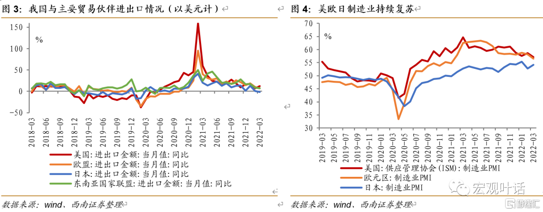 一季度外貿增長平穩,出口韌性仍在。按美元計,一季度我國進出口總值同比增長13.0%,外貿整體較平穩。其中,1-3月出口總值同比增長15.8%,俄烏衝突對全球供應鏈形成壓力,多地對俄實施經濟制裁,對我國出口形成支撐;進口受俄烏衝突等影響不及預期,進口總值同比增速爲9.6%。整體來看,疫情擾動,國內生產受到一定影響,但海外需求旺盛仍佔主導,再加上匯率因素影響,我國出口仍保持韌性。3月出口同比增長14.7%,而進口同比下降0.1%。國內疫情對生產有一定影響,但在政府擴大高水平對外開放,推動外貿外資平穩發展的背景下,預計海外需求仍將對出口形成一定支撐;俄烏衝突、全球供應鏈問題持續影響進口,疊加基數效應,預計進口延續較弱態勢。
