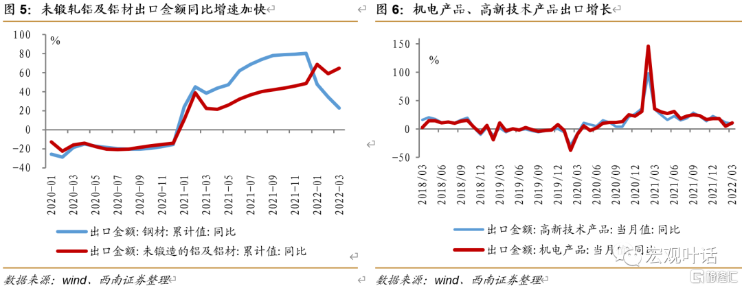 從出口商品看,一季度受俄烏衝突影響,鋁出口增速較高,在海外供應鏈受打擊、國內復產節奏較快作用下,勞動密集型、機電產品出口受到支撐。在海外需求較高、供應鏈尚在恢復等因素作用,以美元計,1-3月我國機電產品出口同比增長12.1%,處於較高水平,較前值回落0.4個百分點;佔出口總額的58.67%,佔比維持在較高位置。其中,通用機械設備、集成電路、汽車(包括底盤)的出口增速都超過18%,汽車(包括底盤)1-3月出口金額增長87.1%,較1-2月增速回落16.5個百分點。在國內政策支持以及全球需求旺盛的推動下,新興產業的出口也較穩定,電動載人汽車、太陽能電池、鋰電池出口增速可觀。1-3月高新技術產品出口增速較前值回落1.8個百分點至12.9%,佔出口總額的30.10%,較1-2月佔比回落1.02個百分點。勞動密集型產品的出口也呈現較好態勢。1-3月,塑料製品、紡織紗線、織物及其製品,服裝及衣着附件,鞋靴,玩具的出口金額同比分別增長16.9%、15.1%、7.4%、23.0%和19.4%,高基數下分別較前值加快2.2、3.2、1.3、1.2和回落2.6個百分點。2月以來,俄烏衝突的全面爆發刺激了鋁價加速上行,2021年下半年歐洲地區能源成本飆升,多家電解鋁企於21年年末宣佈減產,影響延續造成當前海外現貨鋁錠供應緊張;2022年春節後俄烏衝突升級,市場對於2018年俄鋁製裁事件重演的預期上升。1-3月,未鍛軋鋁及鋁材出口金額同比增長64.8%,增速較前值繼續上升5.8個百分點。此外,糧食,家用電器,船舶,燈具、照明裝置及其零件一季度出口金額增速爲負值。